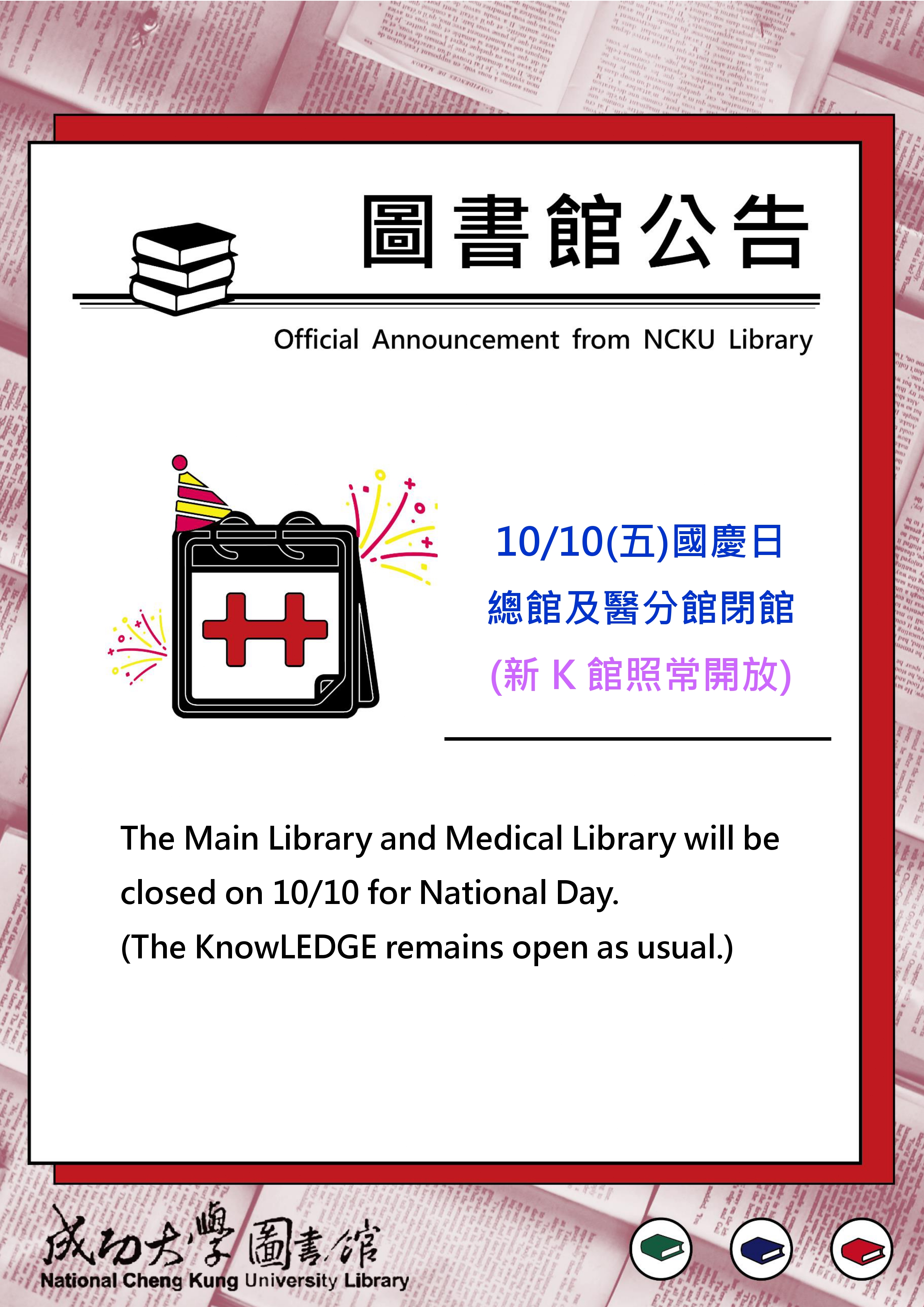 10/10(五)國慶日放假,總館及醫分館閉館,新K館照常開放。